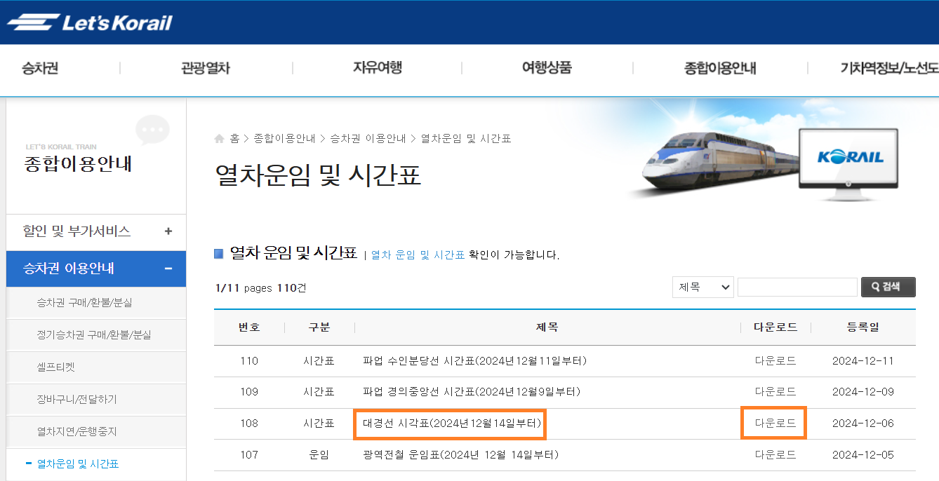 위 링크를 통해 코레일 홈페이지에서 대경선 시각표를 다운로드합니다.