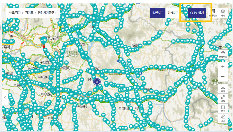 오른쪽 위 상단의 CCTV열기를 선택하면, 노선을 선택하지 않아도 실시간 교통정보를 볼 수 있는 CCTV 아이콘들이 모두 나타나기 때문에 원하는 위치의 아이콘을 눌러 영상을 볼 수 있습니다.