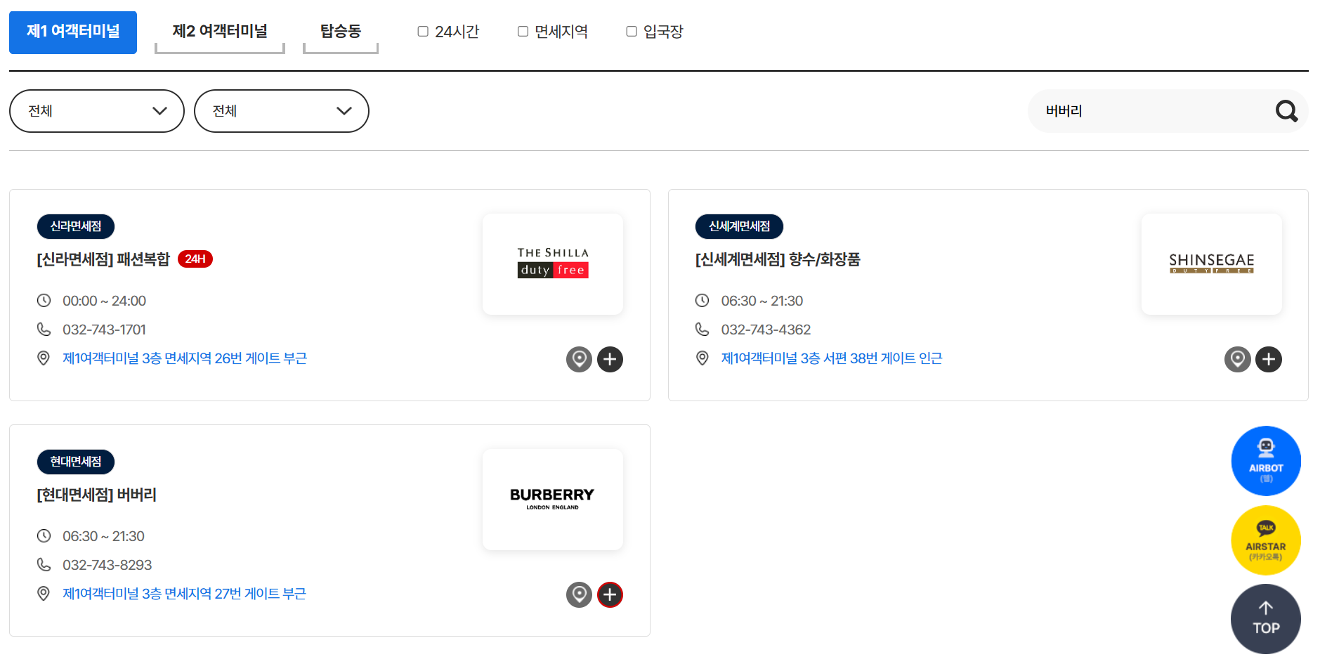 위 사진처럼, 제1 여객터미널에 버버리가 입점된 면세점 세 군데의 정보가 뜹니다. 매장마다 각각의 매장 영업 시간과 전화번호, 위치가 나타나 있습니다.