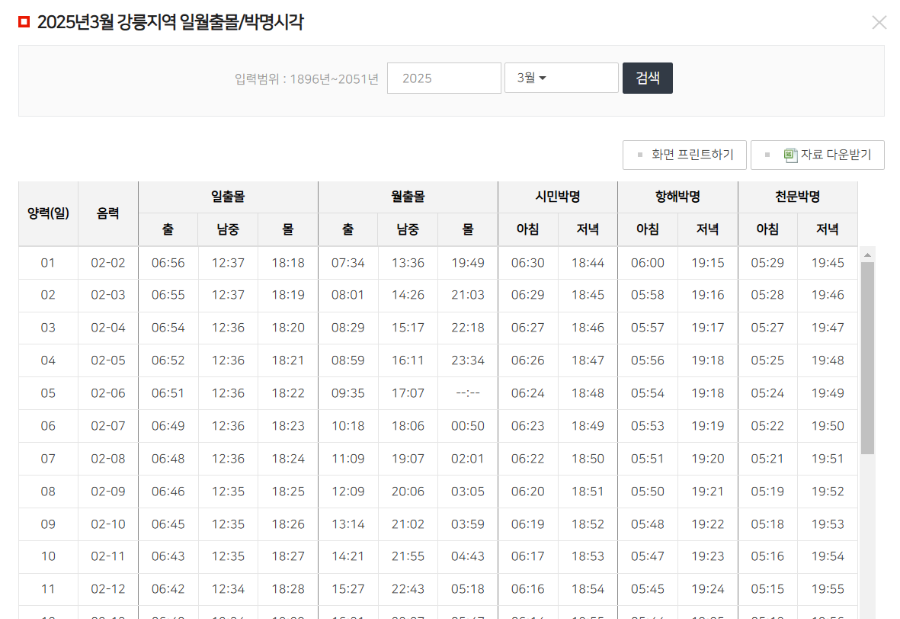 다음 예시는 강원도 강릉 지역의 월별 해/달 출몰시각을 검색하였을 때입니다.