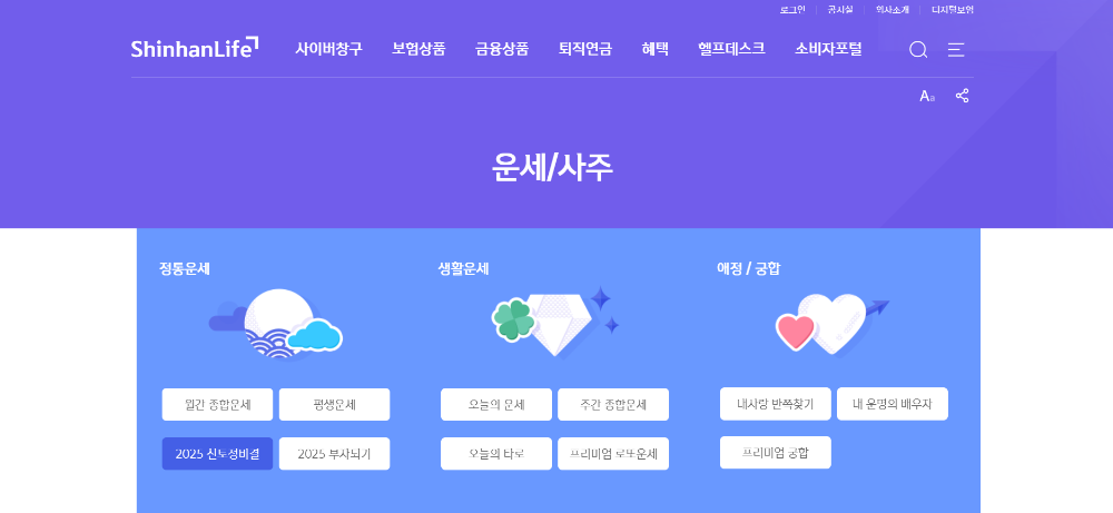 평생운세, 2025년 신토정비결, 월간 종합운세 등 정통운세와 주간 종합운세, 오늘의 운세 등의 생활운세, 재물운세, 애정 및 궁합과 관련된 운세 등을 무료로 확인하실 수 있습니다.