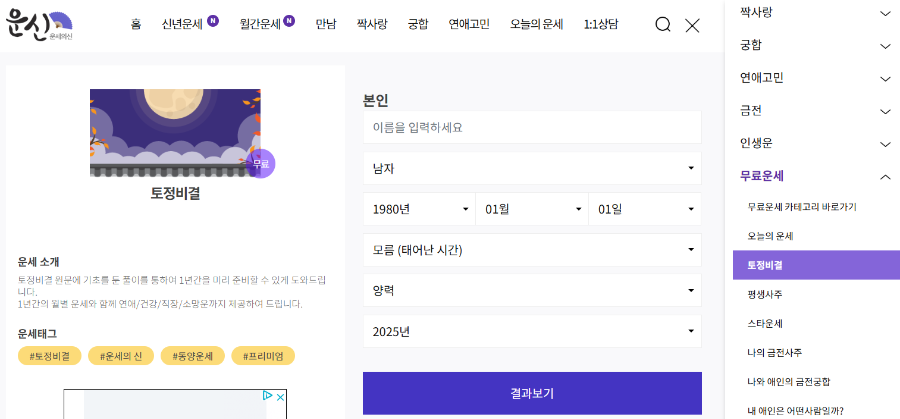 2025년 신년운세를 비롯해 총운, 애정운, 직업운, 재물운, 사업운, 건강운 등을 확인할 수 있습니다.